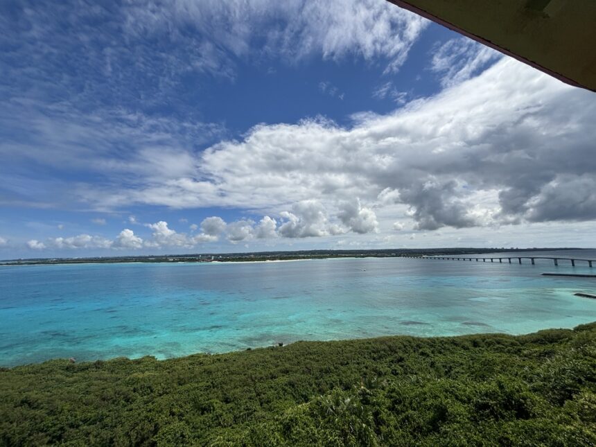 到着したらまず竜宮城展望台から海を見に行きました。宮古島は、宮古ブルーとも言われるほど海が綺麗です。どこから見てもエメラルドグリーンのような色をしている海で見惚れました。余談ですが、沖縄の方は海に入る方は少なく、見るものだと教えられるそうです。